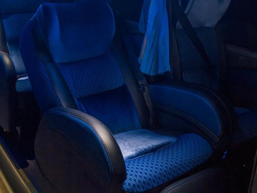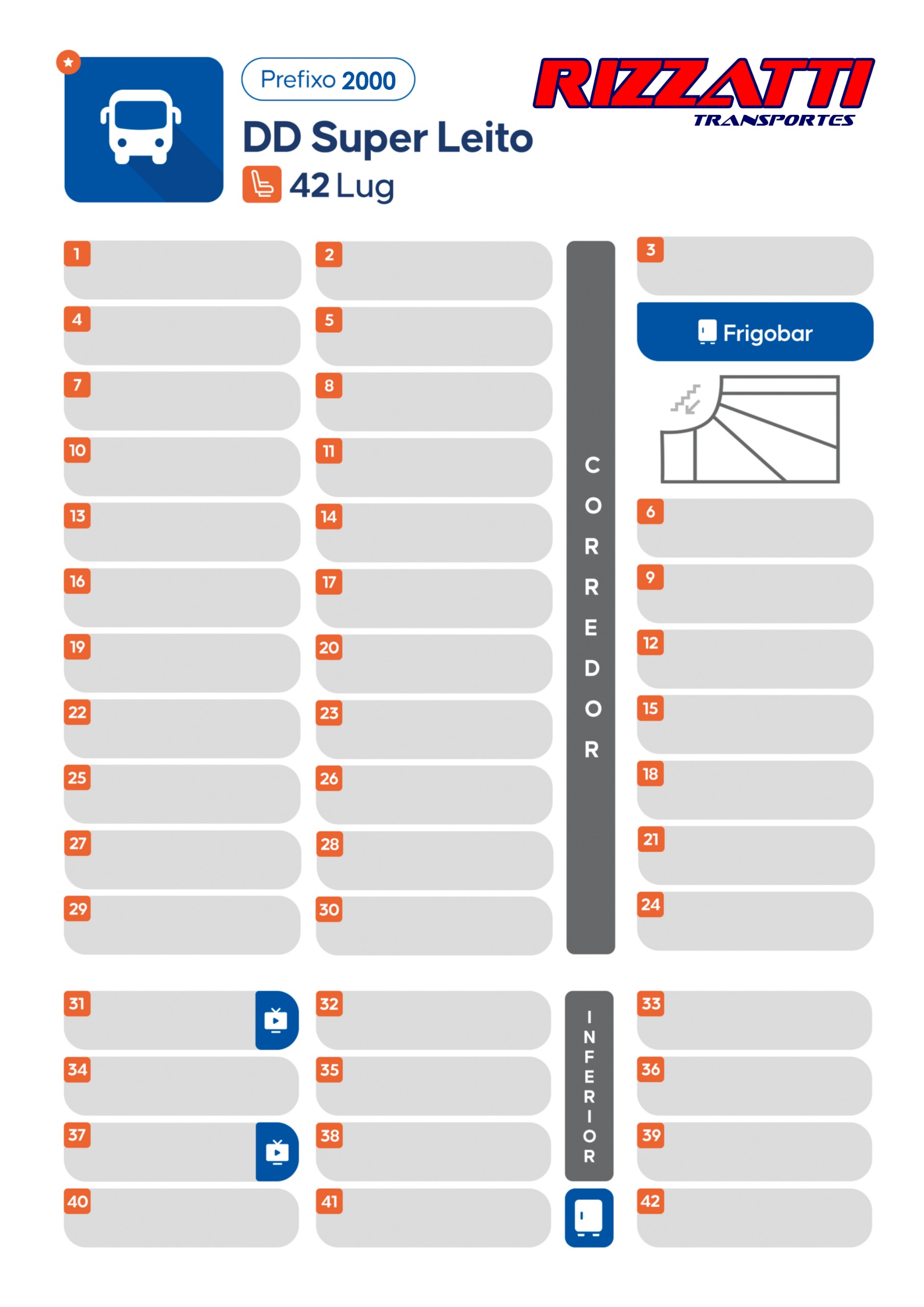 Double Deck (DD), 42 lugares poltronas Leito-total, vidros colados, ar condicionado, 03 frigobares elétrico (um no piso inferior e dois no piso superior), Toalete, 05 Tvs (Tela-plana), DVD, sistema de microfone & som, Internet a bordo (STARLINK), calefação e mesa de jogos (opcional).